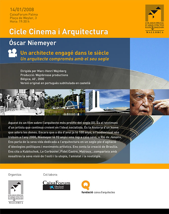 La Demarcación Mallorca del COAIB organiza la proyección del documental «Óscar Niemeyer un arquitecto comprometido con su siglo» (Óscar Niemeyer un architecte engagé dans le siècle) que se llevará a cabo el próximo lunes, día 14 de enero de 2008, a las 19:30 h., en el CaixaFòrum de Palma. La proyección de este documental es posible gracias a la cesión de derechos adquiridos por la Fundación Caja de Arquitectos mediante la financiación obtenida del Fondo de Educación y Promoción de la Caja de Arquitectos.