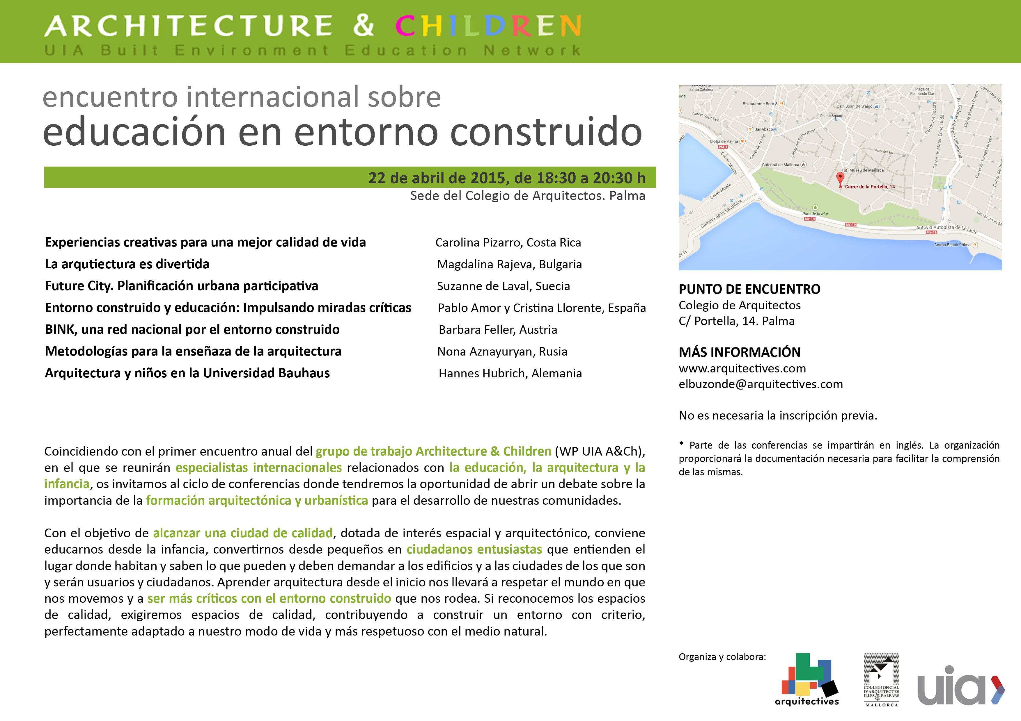 Coincidiendo con el primer encuentro anual del grupo de trabajo Architecture & Children de la Unión Internacional de Arquitectos (WP UIA A&Ch), en el que se reunirán especialistas internacionales relacionados con la educación, la arquitectura y la infancia, el grupo Arquitectives, con la colaboración del COAIB, organiza este ciclo de conferencias donde se ofrecerá la oportunidad de debatir sobre la importancia de la formación arquitectónica y urbanística para el desarrollo de nuestras comunidades, que se celebrará el 22 de abril de 2015, en el salón de actos de la sede central del COAIB (Portella, 14 – Palma).