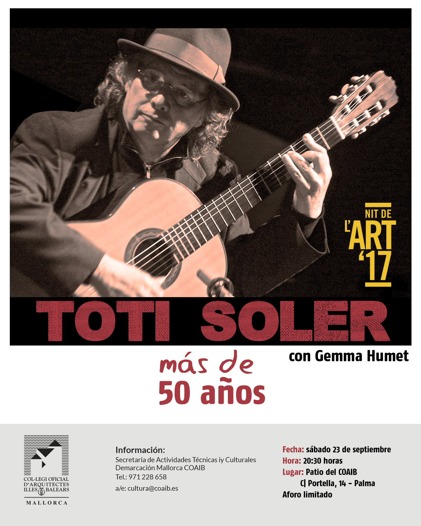 “Música i poesia, dues formes d'art germanes que juntes creixen i germinen. Dues veus unides cap a l'emoció. Així toca i canta Toti Soler acompanyat de la deliciosa veu de Gemma Humet. Un captivador recorregut pel seu exquisit univers de guitarra i cançó: tan mediterrani, tan contemporani, tan universal; a través dels millors temes que ha escrit durant els més de cinquanta anys de dedicació a la guitarra i a la composició amb la seva forma personal sensible i profunda de compondre, interpretar i posar veu als poetes”.