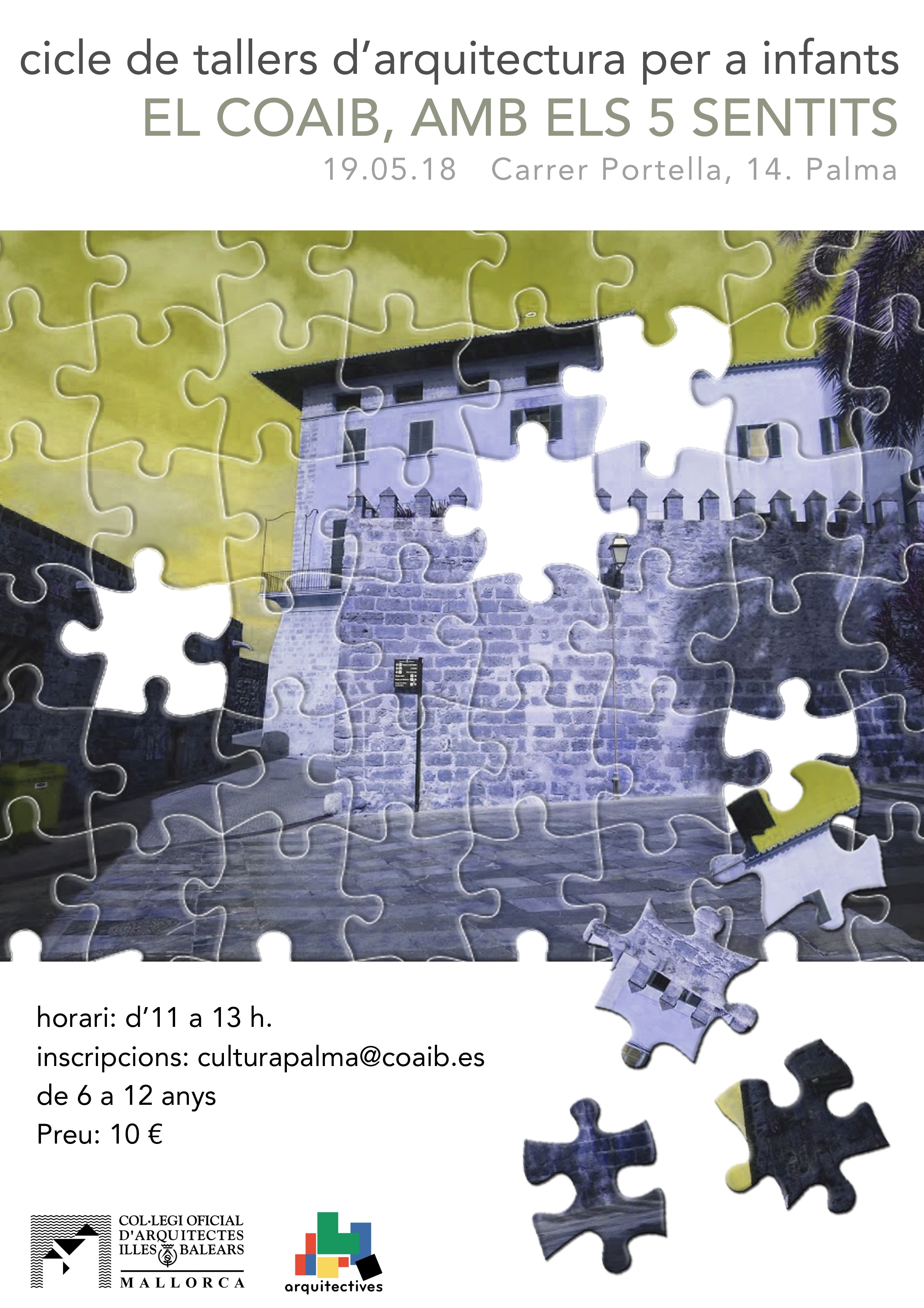 Arquitectives, gabinet format pels arquitectes Cristina Llorente i Pablo Amor, organitza, amb la col·laboració de la vocalia de Cultura de la Demarcació Mallorca del COAIB, un taller d'arquitectura per a infants El COAIB amb els 5 sentits, en el qual s’investigarà l’edifici del COAIB des del punt de vista sensorial, descobrint-ne les seves formes, ombres, sons, olors i textures. A manera de gimcana, els participants elaboraran un àlbum analític del Col·legi d’Arquitectes.