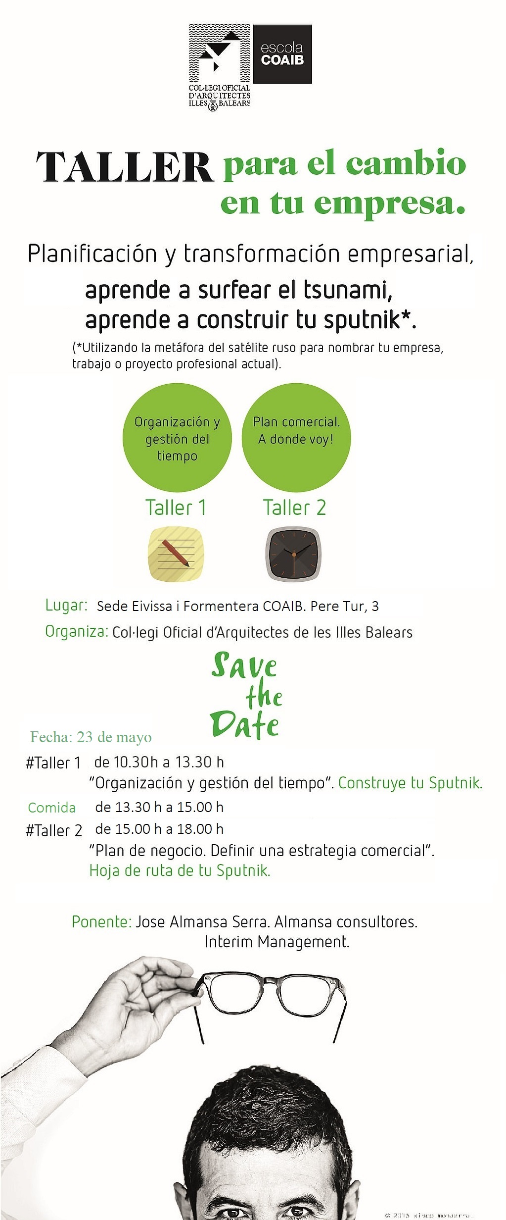 Se celebrarà el dimecres 23 de maig de 2018, en horari de 10:30 a 18 hores, a la seu de la demarcació Eivissa-Formentera del COAIB (carrer Pere Tur, 3 – Dalt Vila), a càrrec de José Almansa Serra, Ínterin Management i consultor empresarial.