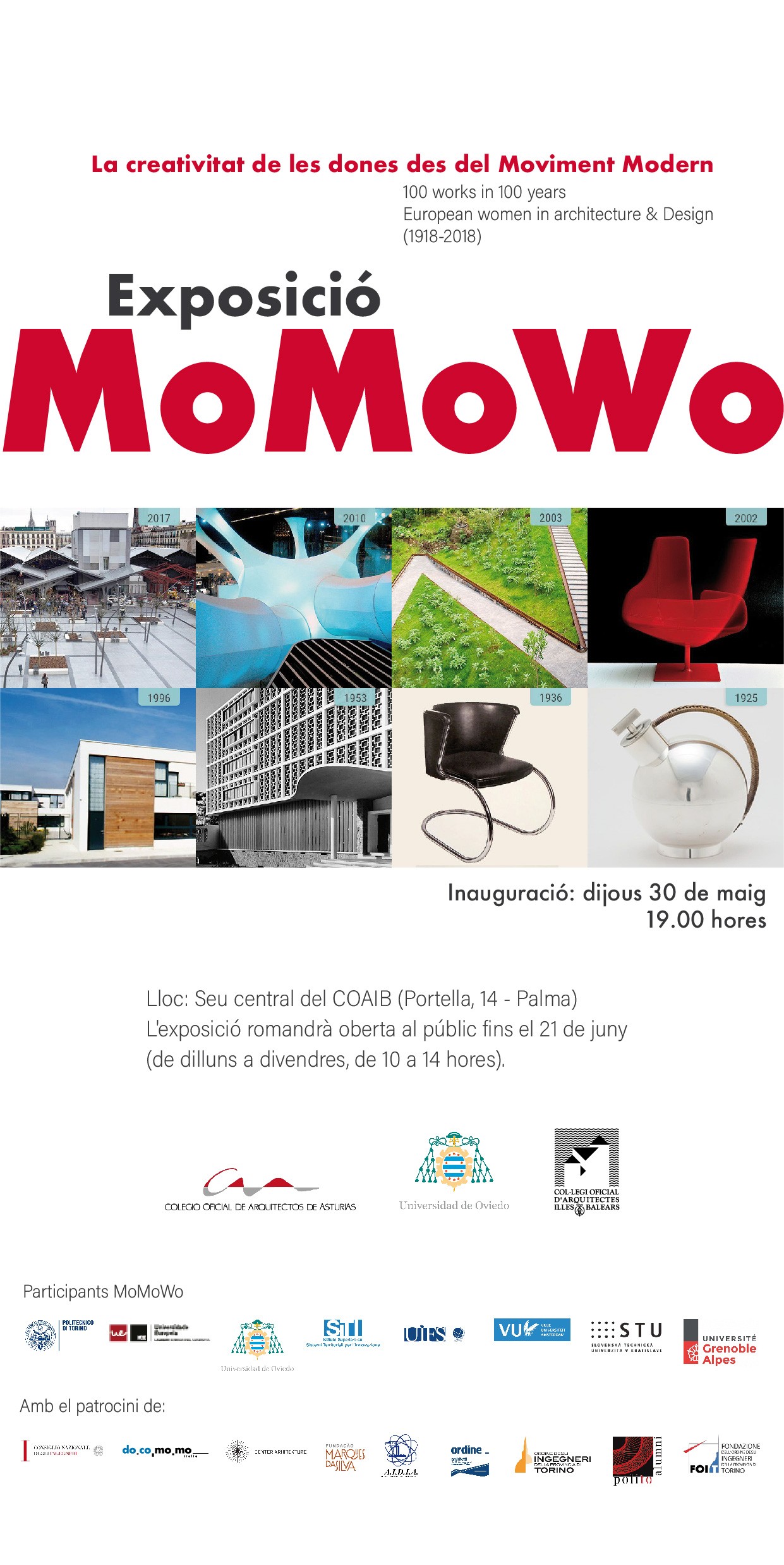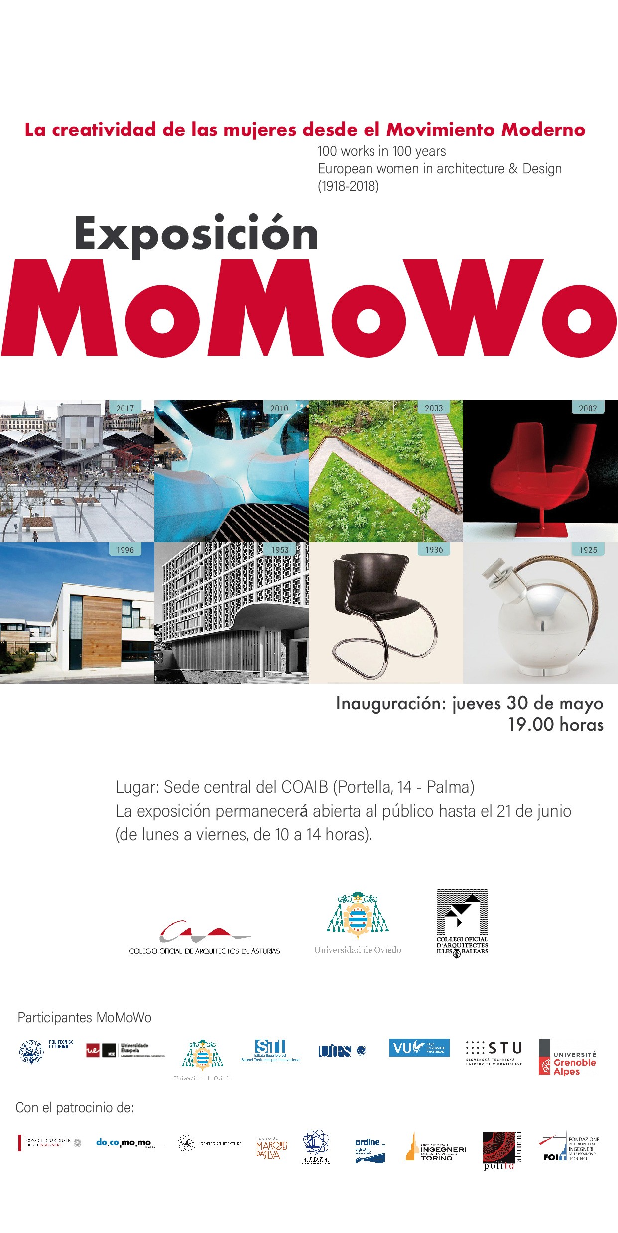 La Demarcació Mallorca del COAIB itinera l'exposició MoMoWo: La creativitat de les dones des del Moviment Modern, produïda pel Col·legi Oficial d'Arquitectes d'Astúries. L'objectiu d'aquest projecte és compartir, difondre i posar en valor l'important patrimoni cultural europeu forjat per les dones que treballen, des del moviment modern, en l'àmbit de l'arquitectura, l'enginyeria civil, l'urbanisme, el paisatgisme i el disseny d'interiors i industrial. La seva intervenció ha tingut una important relevancia cultural i social i ha estat en gran manera “amagada o oculta de la història oficial”. MoMoWo destaca, descriu i debat les diverses contribucions de les dones en les professions del disseny, promovent la seva importància cultural i econòmica. Aquests camps van ser, i en algun cas actualment es perceben, com a professions dominades per homes. Aquest projecte desmunta aquesta actitud, en exposar treballs notables i importants de dissenyadores tant del passat com del present.