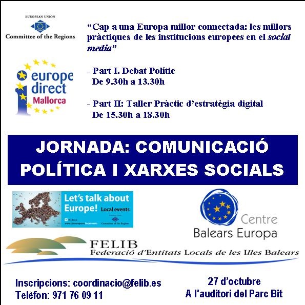 Durant aquesta jornada, organitzada amb la participació del Comitè Europeu de Regions i el Centre Balears Europa, es durà a terme un debat sobre el paper polític dels nous social media (facebook, twitter, web 2.0 i d’altres), i es realitzarà un taller pràctic de comunicació digital impartit per els millors especialistes en comunicació pública i estratègia digital de les institucions europees.
