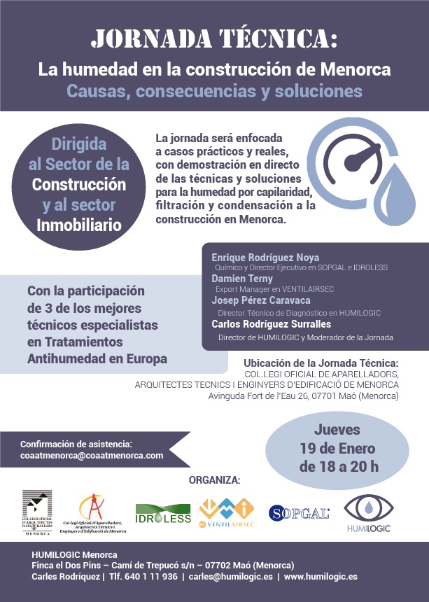Jornada organitzada pel Col.legi Oficial d’Aparelladors i Arquitectes Tècnics de Menorca i la Demarcació Menorca del COAIB conjuntament amb HUMILOGIC, SOPGAL, VENTILAIRSEC i IDROLESS.