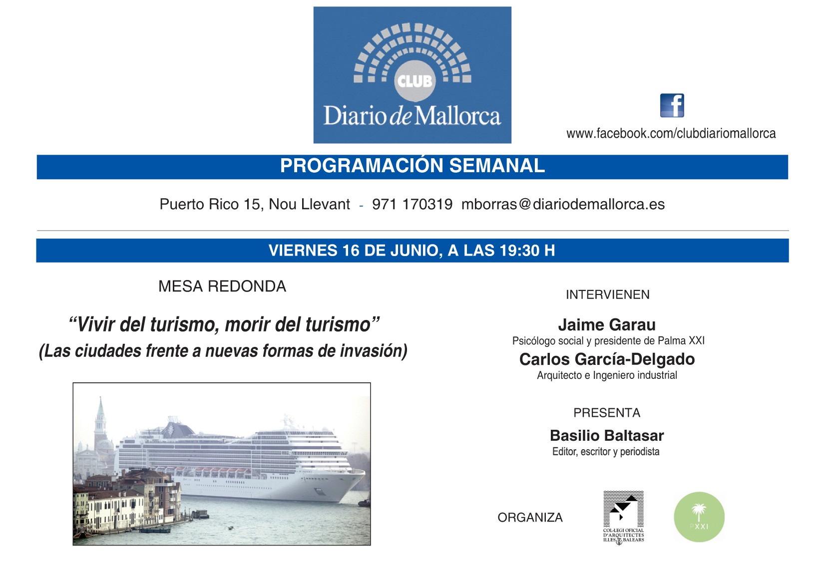El Club Diario de Mallorca, amb la col·laboració del COAIB, organitza la taula rodona Viure del turisme, morir del turisme, en la qual intervindran: Carlos García-Delgado, arquitecte i enginyer industrial i Jaime Garau; psícólogo i president de Palma XXI. Aquest acte, que serà presentat per Basilio Baltasar, editor, escriptor i periodista, tindrà lloc el divendres 16 de juny, a les 19:30 hores, en el Club Diario de Mallorca (c/. Puerto Rico, 15 – Palma).