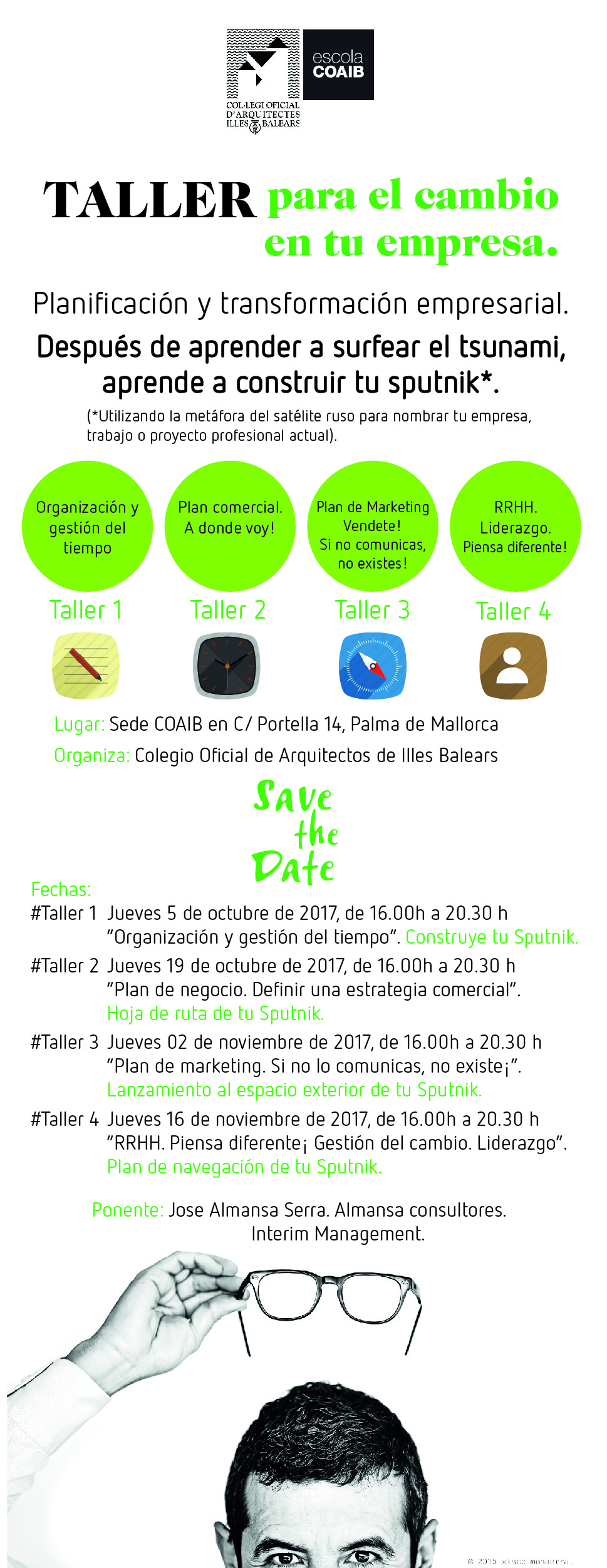 Curs Perfil Empresarial. Taller per al canvi en la teva empresa. Planificació i transformació empresarial. Després d'aprendre a surfear el tsunami, aprèn a construir el teu sputnik*. COAIB, 5 i 19 d'octubre/ 2 i 16 de novembre de 2017.