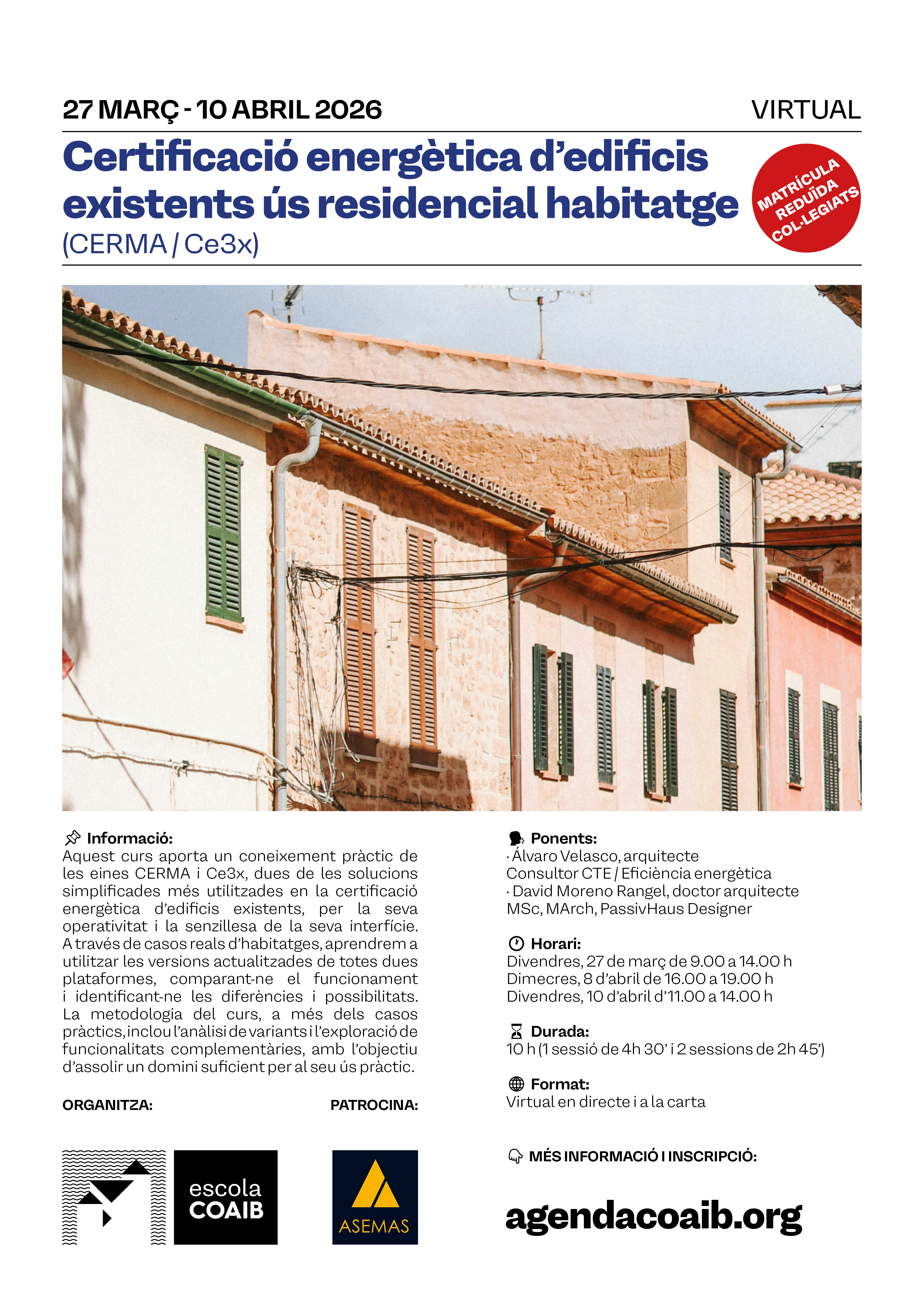 Curso Certificación energética de edificios existentes uso residencial vivienda (CERMA/Ce3x). 27 de marzo, 8 y 10 de abril de 2026.